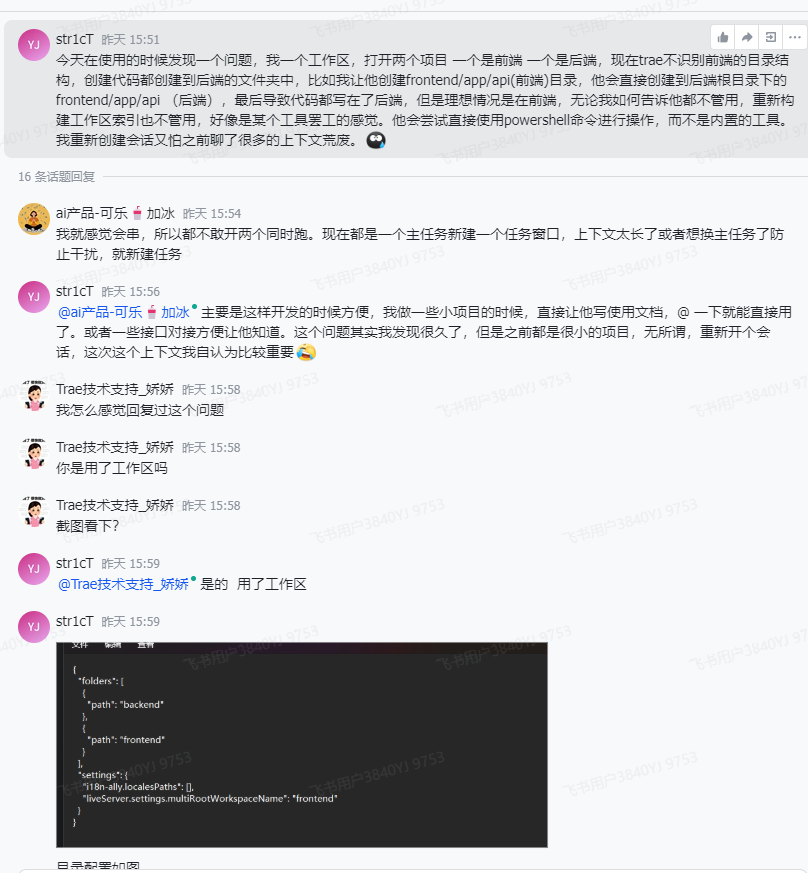 但是在使用Trae进行项目开发的时候,发现使用工作区的时候,有时候AI助手会不理解目录位置(特别是进行创建命令的时候),比如我让他编辑的是frontend文件夹中的app文件夹,但是backend文件夹在frontend文件夹中的前面(说的是工作区文件夹排序),最后他会变成编辑backend文件夹中的app,比如创建api目录,他会直接编辑backend/app/api,而不是frontend/app/api,我个人怀疑是trae内置的工具并不适配工作区,事实也是这样。。。。。。