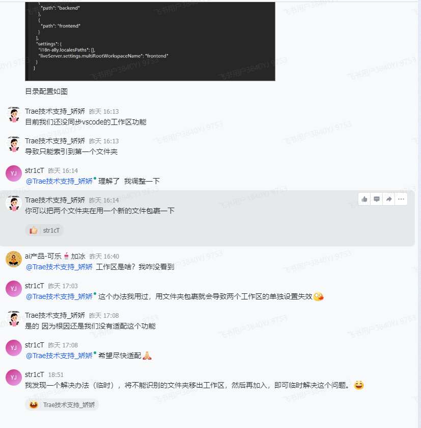 在我咨询了飞书官方答疑群后,管理人员回复就是Trae现在还不支持工作区。